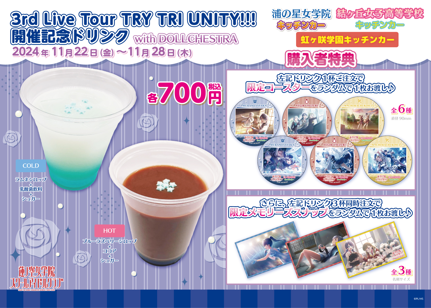 浦の星女学院キッチンカー、虹ヶ咲学園キッチンカー、結ヶ丘女子高等学校キッチンカーより、「ラブライブ!蓮ノ空女学院スクールアイドルクラブ 3rd Live Tour TRY TRI UNITY!!! with DOLLCHESTRA」開催記念ドリンク発売のお知らせです!
