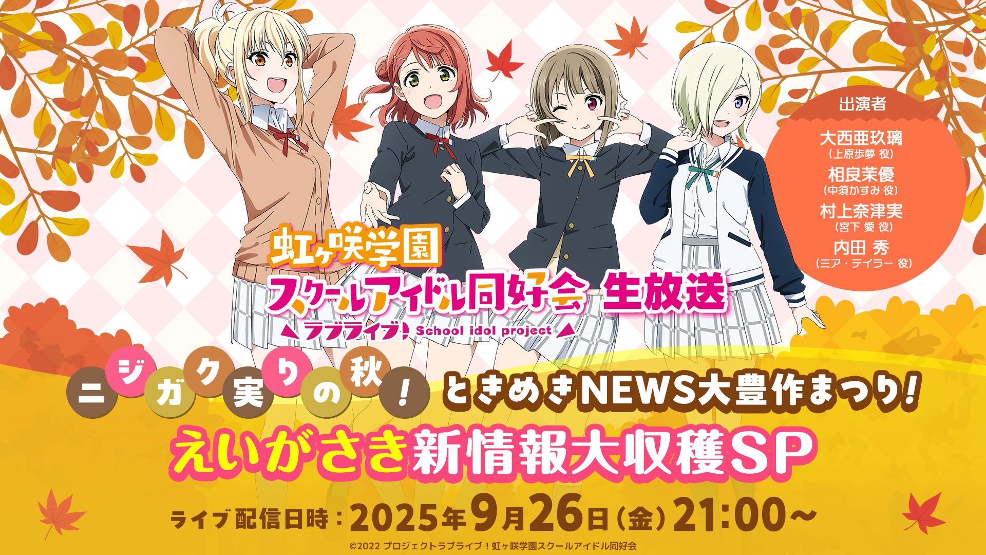 「ラブライブ!虹ヶ咲学園スクールアイドル同好会生放送 ニジガク実りの秋!ときめきNEWS大豊作まつり!えいがさき新情報大収穫SP」のお知らせ!